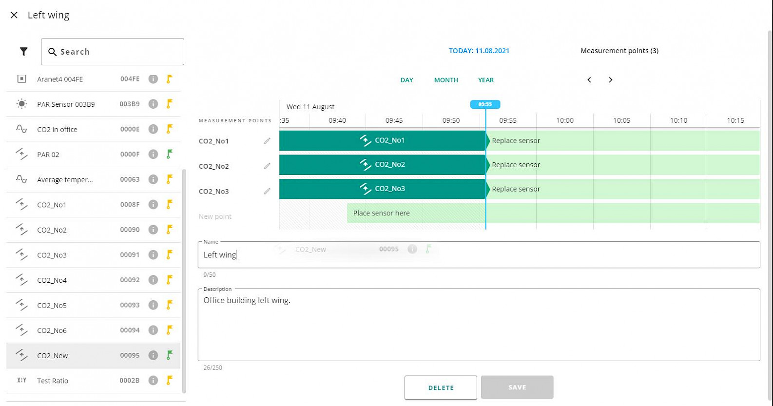 New sensor has replaced the old one in the measurement point starting from the current time. You can adjust replacement time by selecting the sensors ribbon and clicking on the edit icon. ![]()