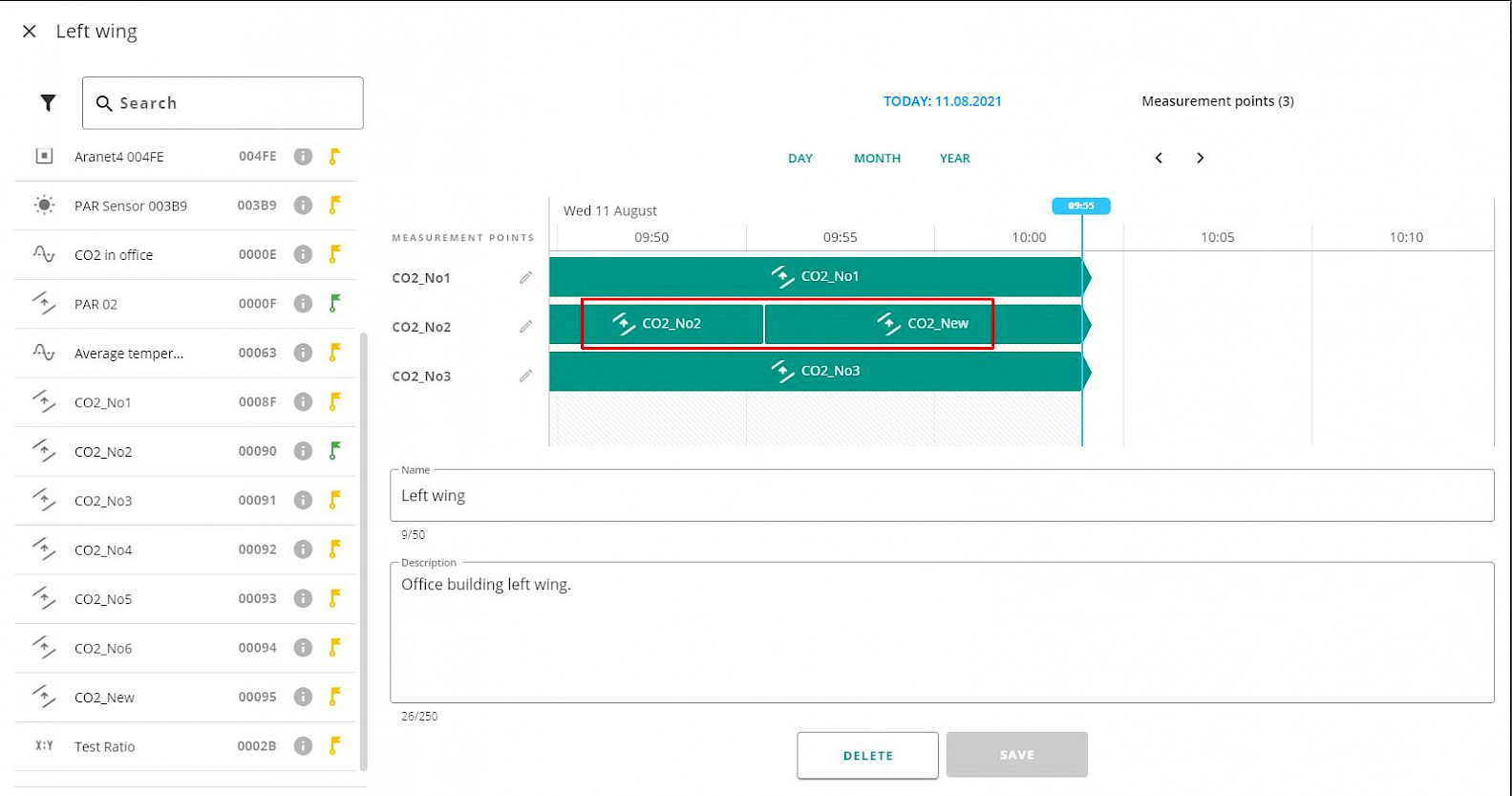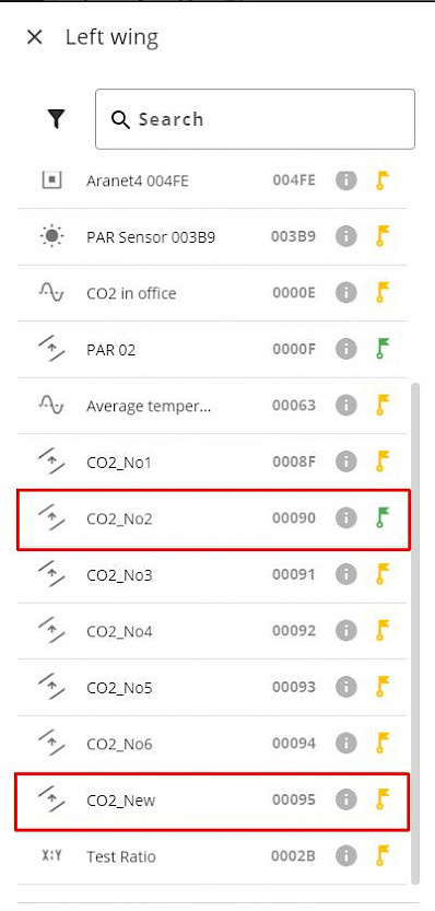 Now the sensor named "CO2_New" changed its status to attached with a yellow flag, and removed from the Asset sensor named "CO2_No2", which became available for attaching to another asset and has a green flag.