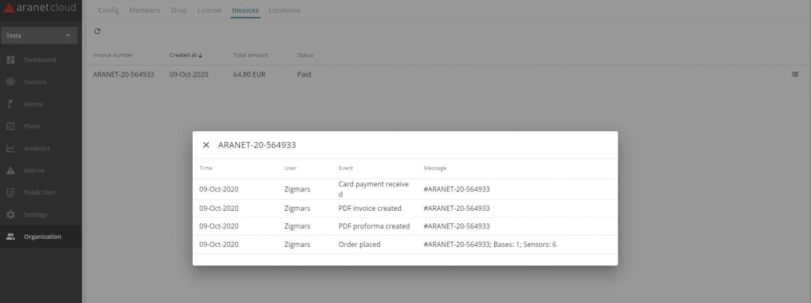 Aranet Cloud Invoices list can be found under WORKSPACE menu INVOICES tab: