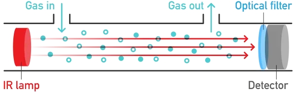 Aranet4 uses a non-dispersive infrared (NDIR) sensor to measure CO2 levels. The device features a small gas chamber with an infrared light source, where CO2 absorbs the light. An optical filter in front of the detector then filters out all light except the wavelength absorbable by CO2 molecules, enabling a precise CO2 concentration level measurement. This CO2 reading method offers higher precision than regular electro-chemical sensors, as it uniquely detects carbon dioxide with no interference from other gases. Furthermore, the NDIR sensor has a much longer lifespan and requires less recalibration than other sensors.